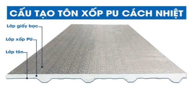 Tôn lợp mái cách nhiệt PU gồm các thành phần chính sau: 2 mặt ngoài là tôn hoặc inox, giấy bạc